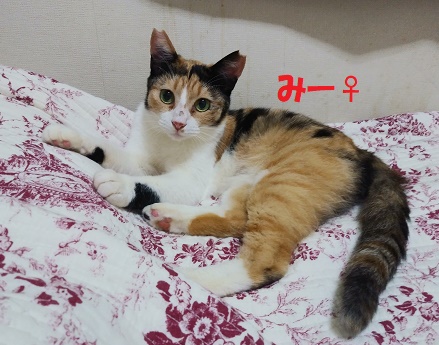 8/22正式決定。おひとり様で迎えていただきました~(^_-)-☆まだ他の人が来るとテレビの後ろとかテーブルの下に隠れてしまうそうですけど、夜 寝る時はお布団の頭のところの横に丸くなって寝てるそうです。良かったね、みーちゃんあなたの天下よ(*^^)v新しい名前は『 はな 』ちゃんです。