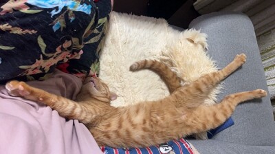 事情があって3年間ケージの中だけで生活していたトラ吉君。今新しいおうちで先住さんと毎日本気のバトル、トラ吉君、先住さん立てて半分力引っ込めて常にはいはいあんたが大将と勝ちを譲ってます(*^^)vバトルが終われば、どこででも身体これでもか位伸ばしてへそ天で爆睡してます(#^^#) こんな幸せあったんだ~