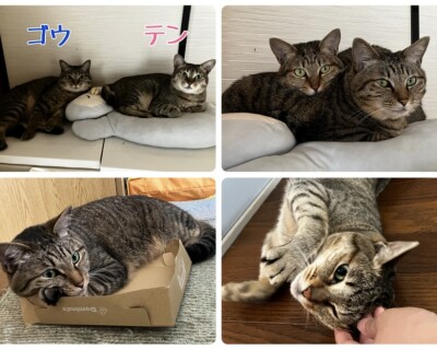 ご無沙汰しています。ゴー君とテンテンちゃんですね。2人とも大きくなりましたね~写真で右側がテンテンですか?ゴー君よりデカい?(笑)(失礼ですよね~)こうして写真で近況教えてくださると病気もなく元気に仲良く過ごしてると嬉しく思います。こんなに丸々しちゃって皆さんに可愛がっていただいてるんですね、ありがとうございます。これからも健康でW家のみなさんの癒し猫さんでいてくださいよ。頑張れ、ゴーテンさん\(^o^)/